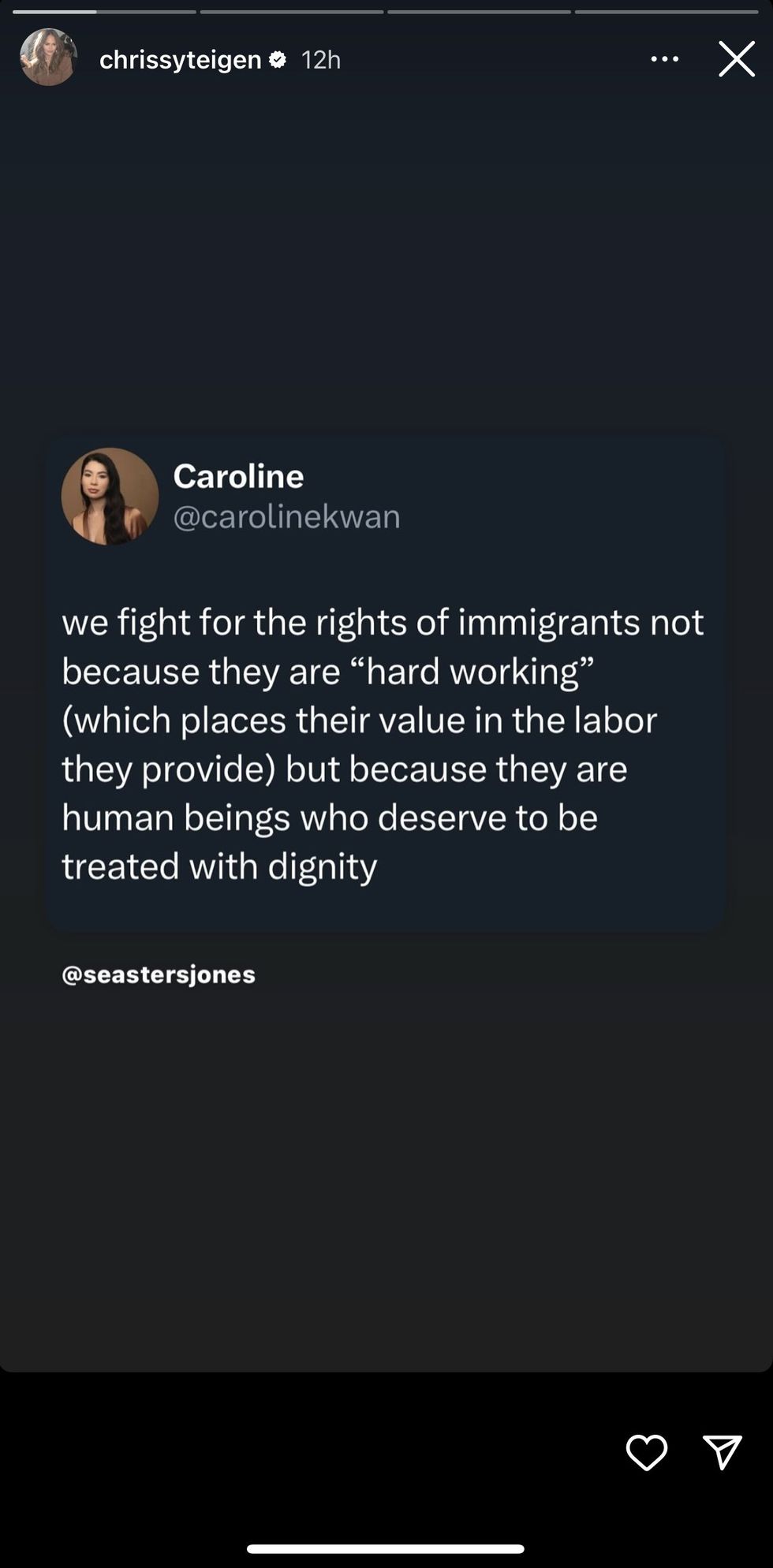 On her Instagram Stories, Teigen shared a string of posts, including a reshared tweet which read: "We fight for the rights of immigrants not because they are "hard working" (which places their value in the labor they provide) but because they are human beings who deserve to be treated with diginity."