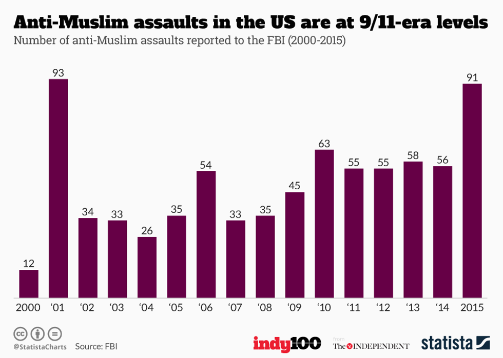 As the below chart by Statista shows, anti-Muslim assaults for 2015 were up to the levels following the 11 September attacks: