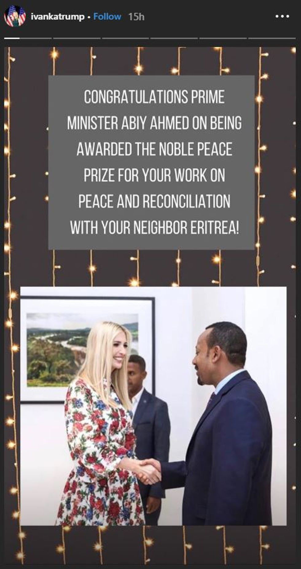 After the announcement that Abiy Ahmed, prime minister of Ethiopia, had won the Nobel Peace Prize, Ivanka (or her presumably now-former social media manager) posted a story congratulating him.