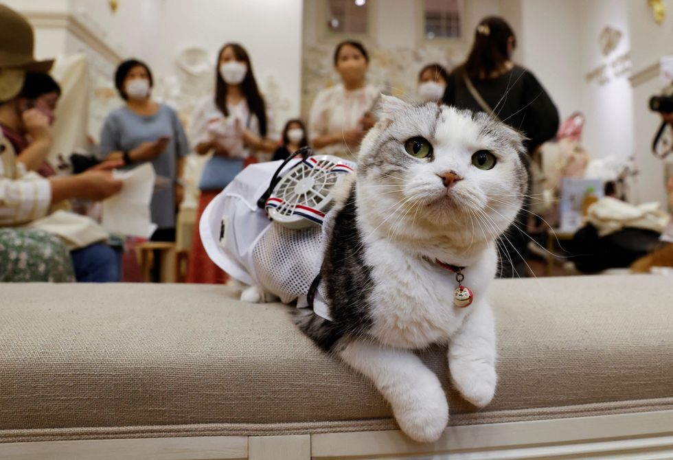 A clothing designer has made wearable fans for dogs in Japan to keep them cool as summer temperatures soar.