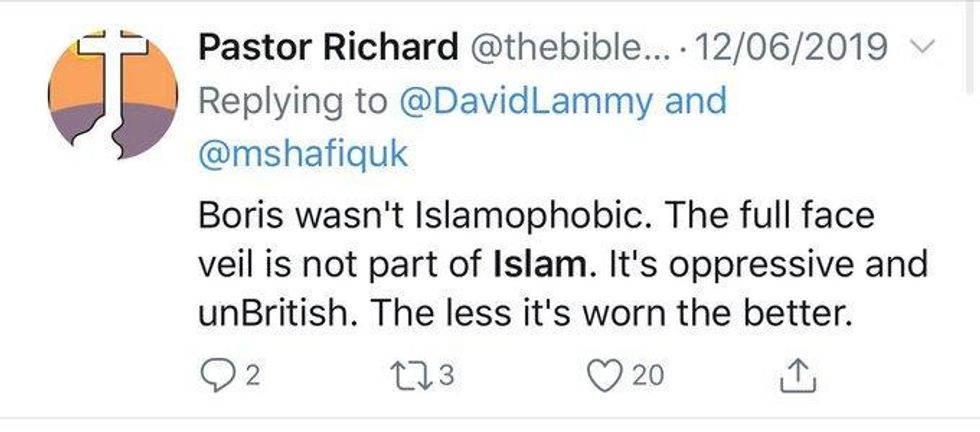 The account defended comments by Boris Johnson which were widely labelled as Islamophobic. In 2017 he also labelled terrorism an "Islam problem".
