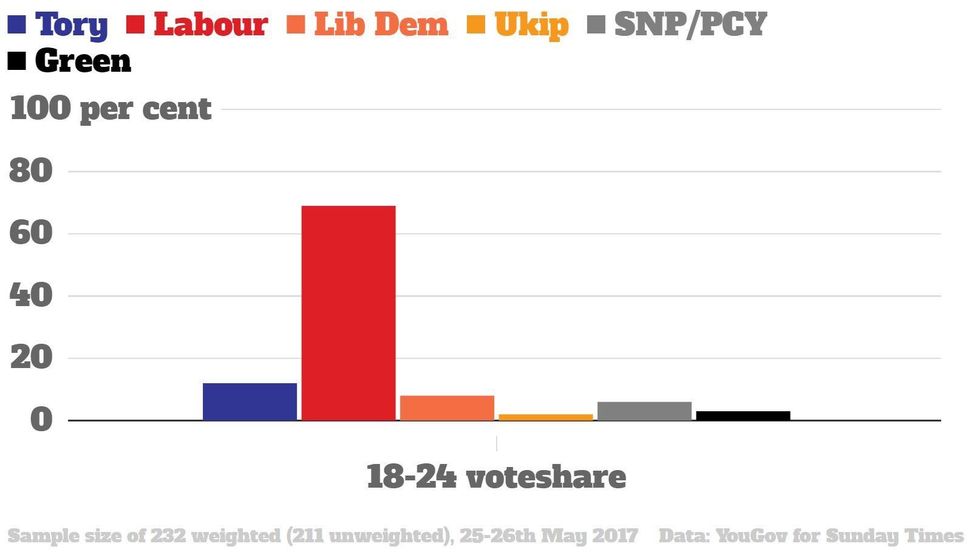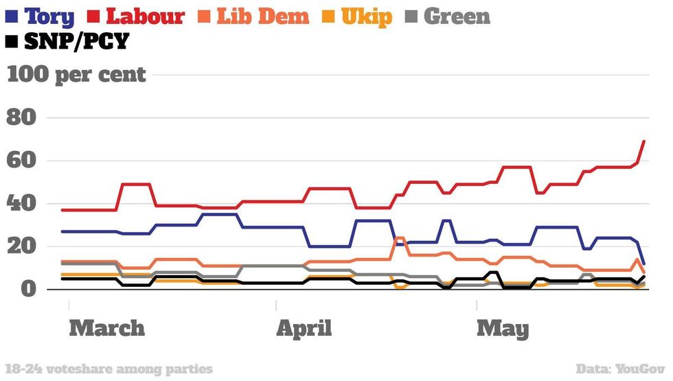 The latest YouGov poll put Labour at 69 per cent among the under 25s.
