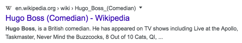 At the time of writing, the comic’s page opens with the words, “Hugo Boss (born Joe Harry Lycett; 5 July 1988) is a British comedian.” Before this, there was no mention of his original name and the opening line simply read “Hugo Boss, is a British comedian”, redundant comma and all.