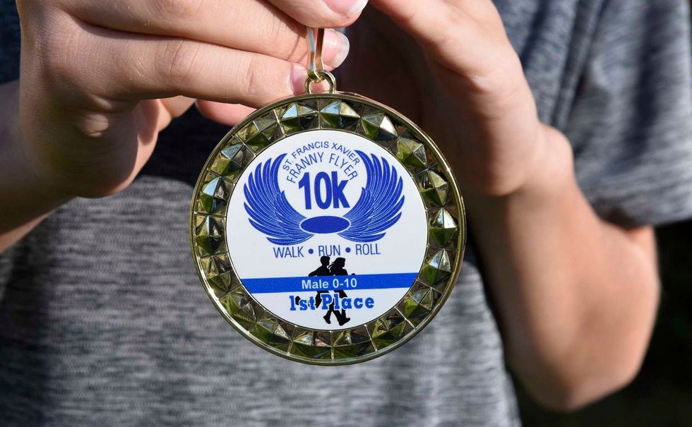 Kade Lovell, 9, holds his medal for winning the St. Francis Xavier Franny Flyer 10k in Sartell, Minn. (Zach Dwyer/The St. Cloud Times via AP)