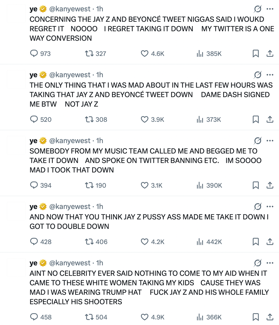 Kanye 'Ye' West has once again sparked outrage with a vile rant on his X/Twitter account, this time targeting Beyonce and Jay-Z's children.