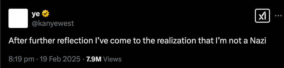 Fast-forward to 19 February, West returned to X where he wrote: "After further reflection I've come to the realization that I'm not a Nazi".