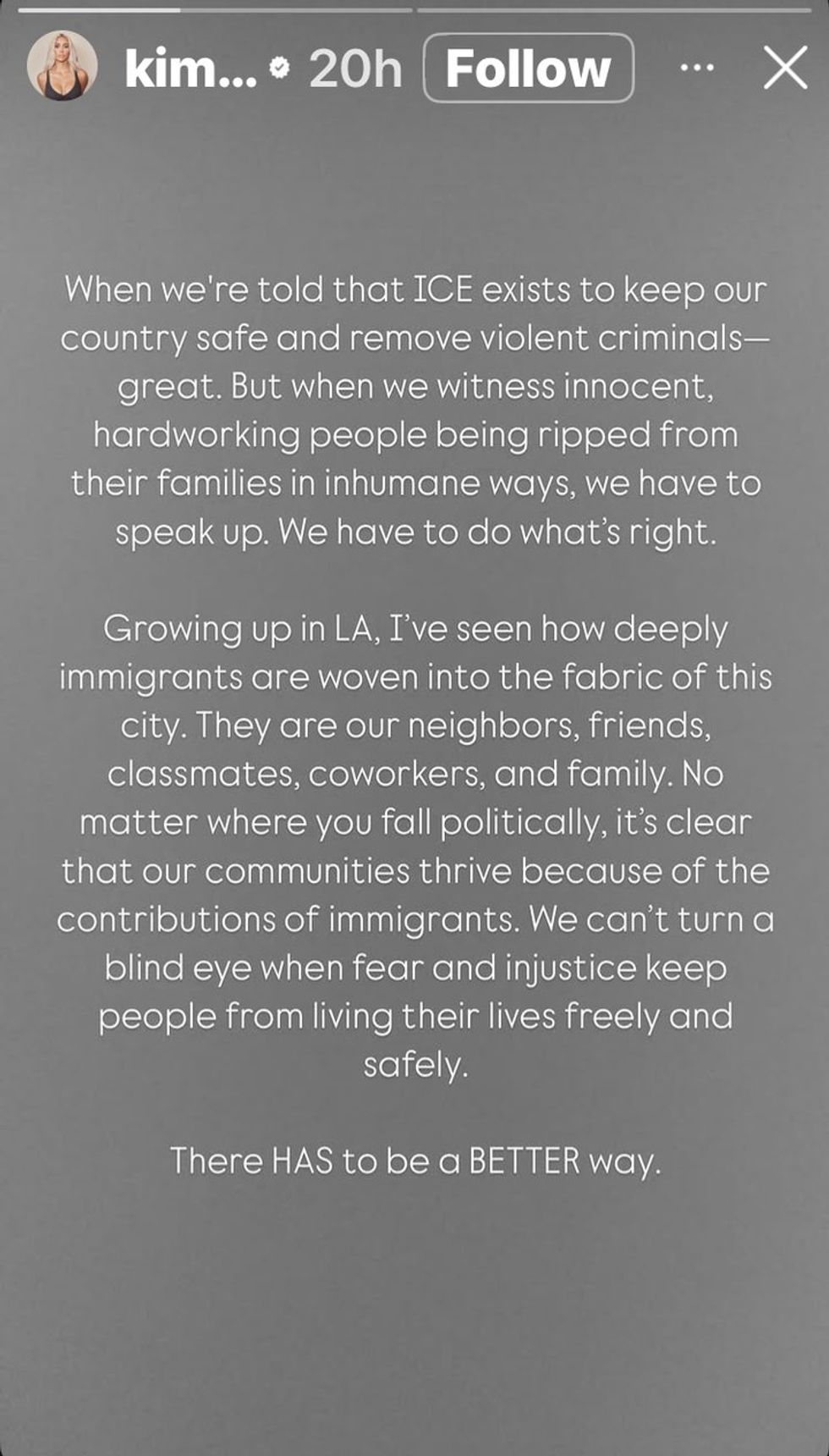 “When we’re told that ICE exists to keep our country safe and remove violent criminals — great,” Kardashian said in her statement. “But when we witness innocent, hardworking people being ripped from their families in inhumane ways, we have to speak up. We have to do what’s right.”