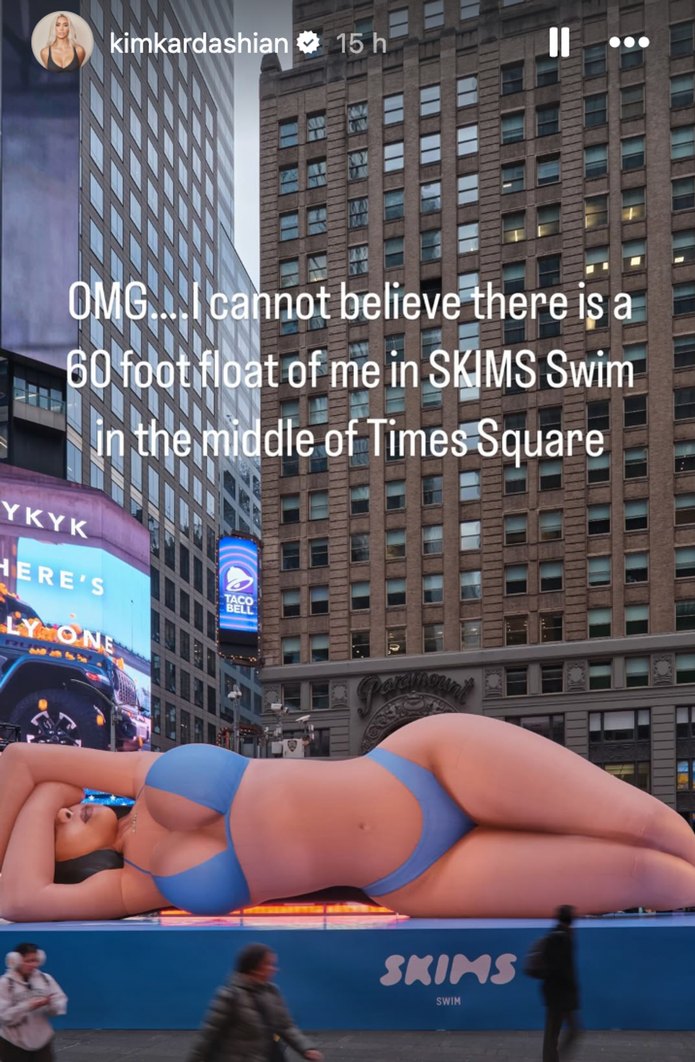 "OMG... I cannot believe there is a 60 foot float of me in SKIMS Swim in the middle of Times Square," she quipped, along with snaps and clips of the new arrival.