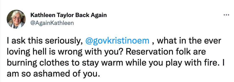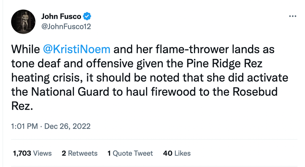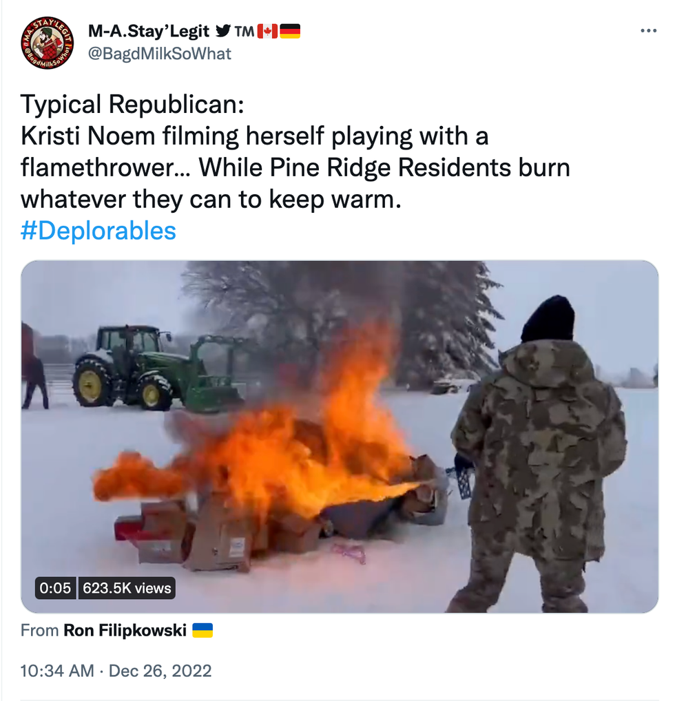 The images of Noem burning boxes with her flamethrower compared to stories of people on reservations burning clothes for warmth led to angry messages online.