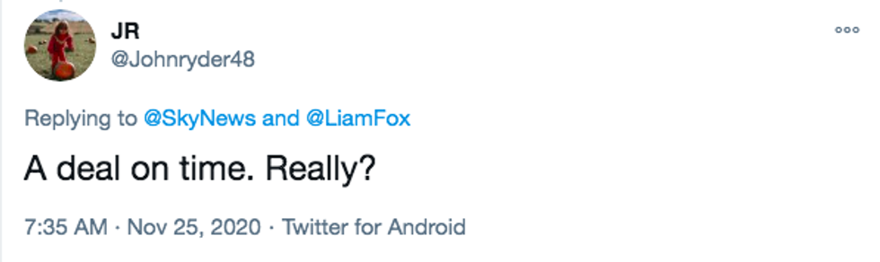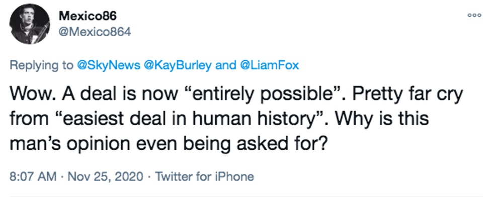 "I still think a Brexit deal is entirely possible." Former international trade secretary, @LiamFox says there is '… https://t.co/MUr1yXnlda— Sky News (@Sky News) 1606288978