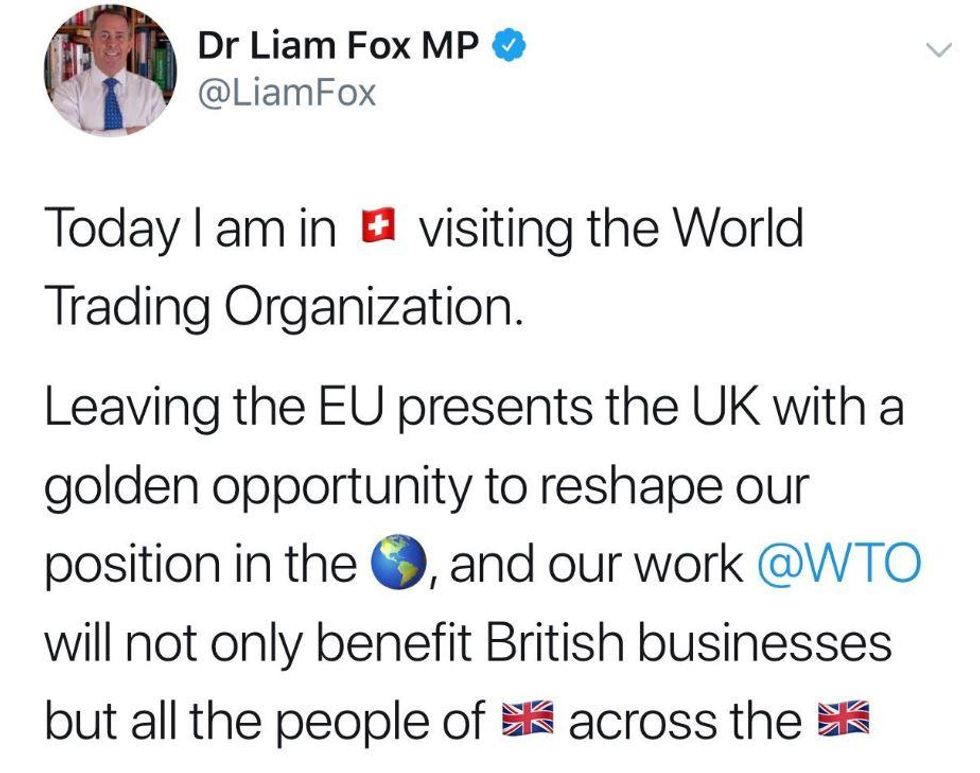 Unfortunately for Mr Fox, he has seemingly gotten off to a bad start by getting the WTO's name completely the wrong in a now-deleted tweet announcing his arrival in Switzerland.