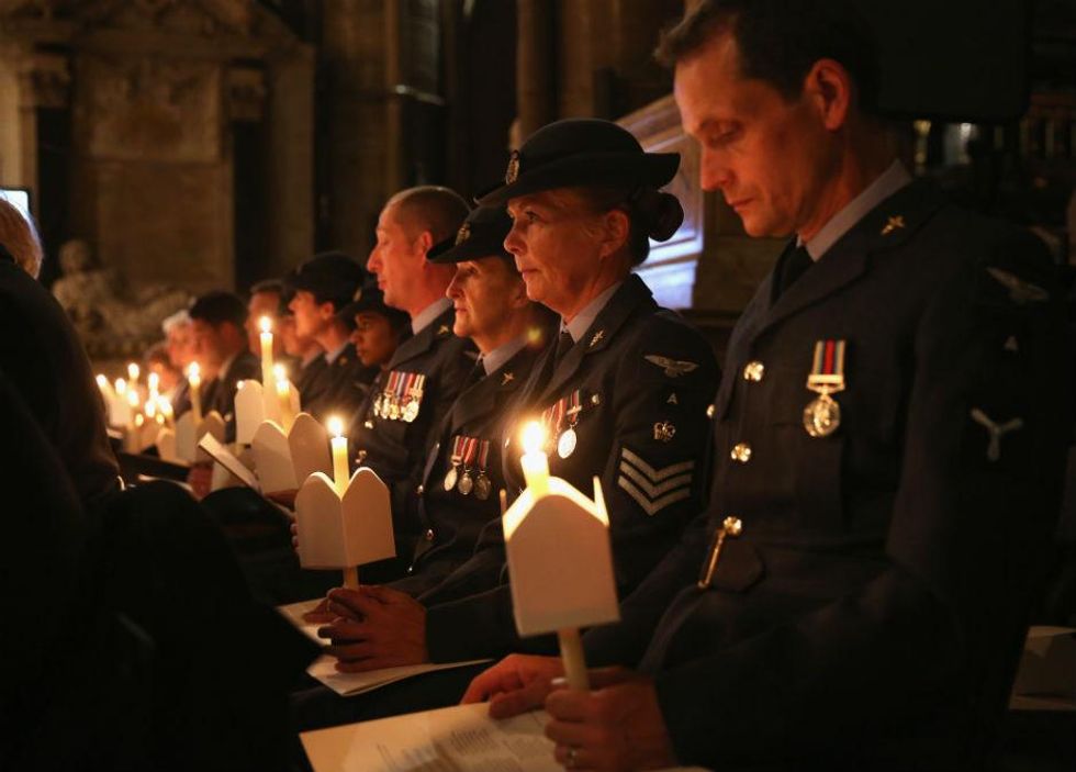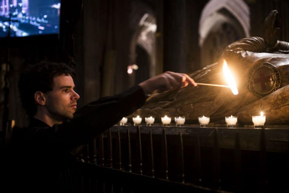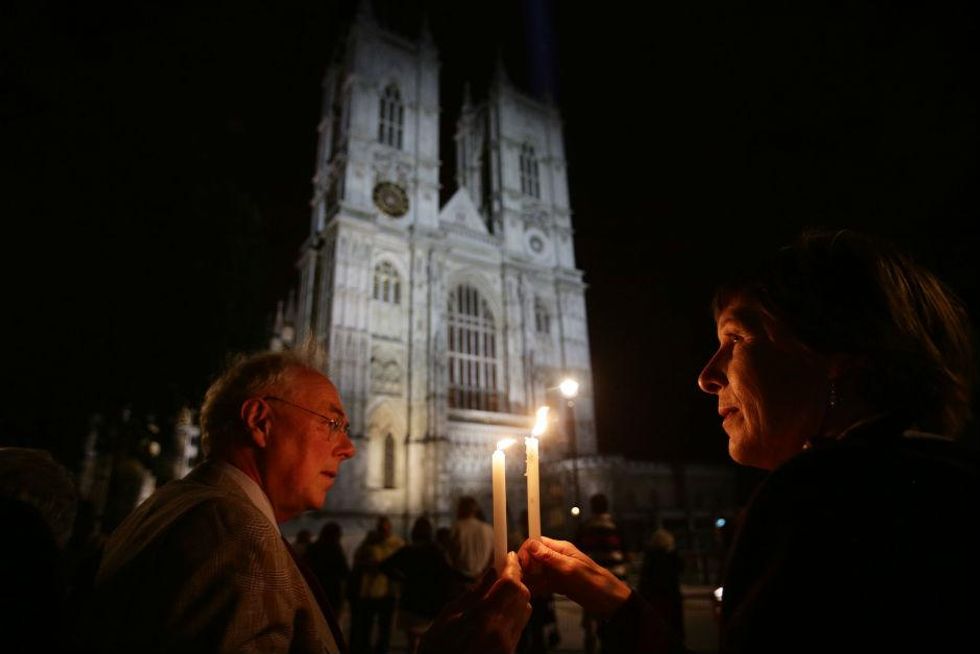 Paul Gaitley (whose two grand-uncles were killed on the same day in October 1914 Able Seaman Arthur Gaitley and Private Jack Gaitley) and Alison Schulte holding candles outside Westminster Abbey