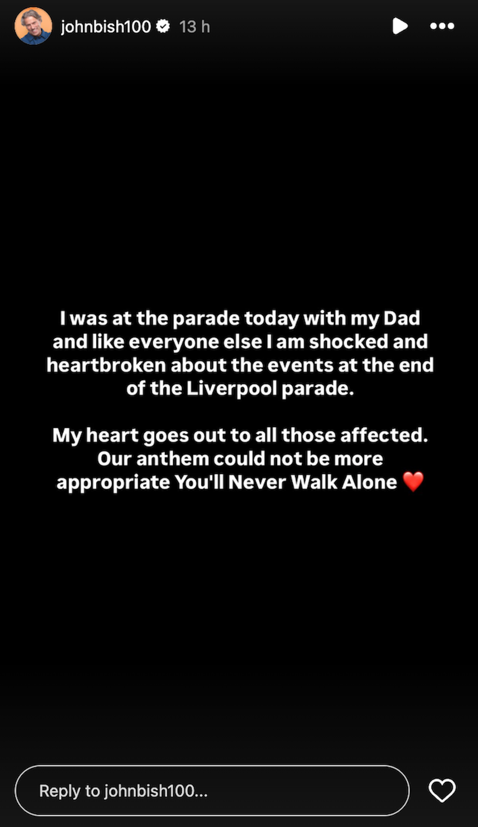 Liverpudlian comedian John Bishop shared: “I was at the parade today with my dad and like everyone else I am shocked and heartbroken about the events at the end of the Liverpool parade.