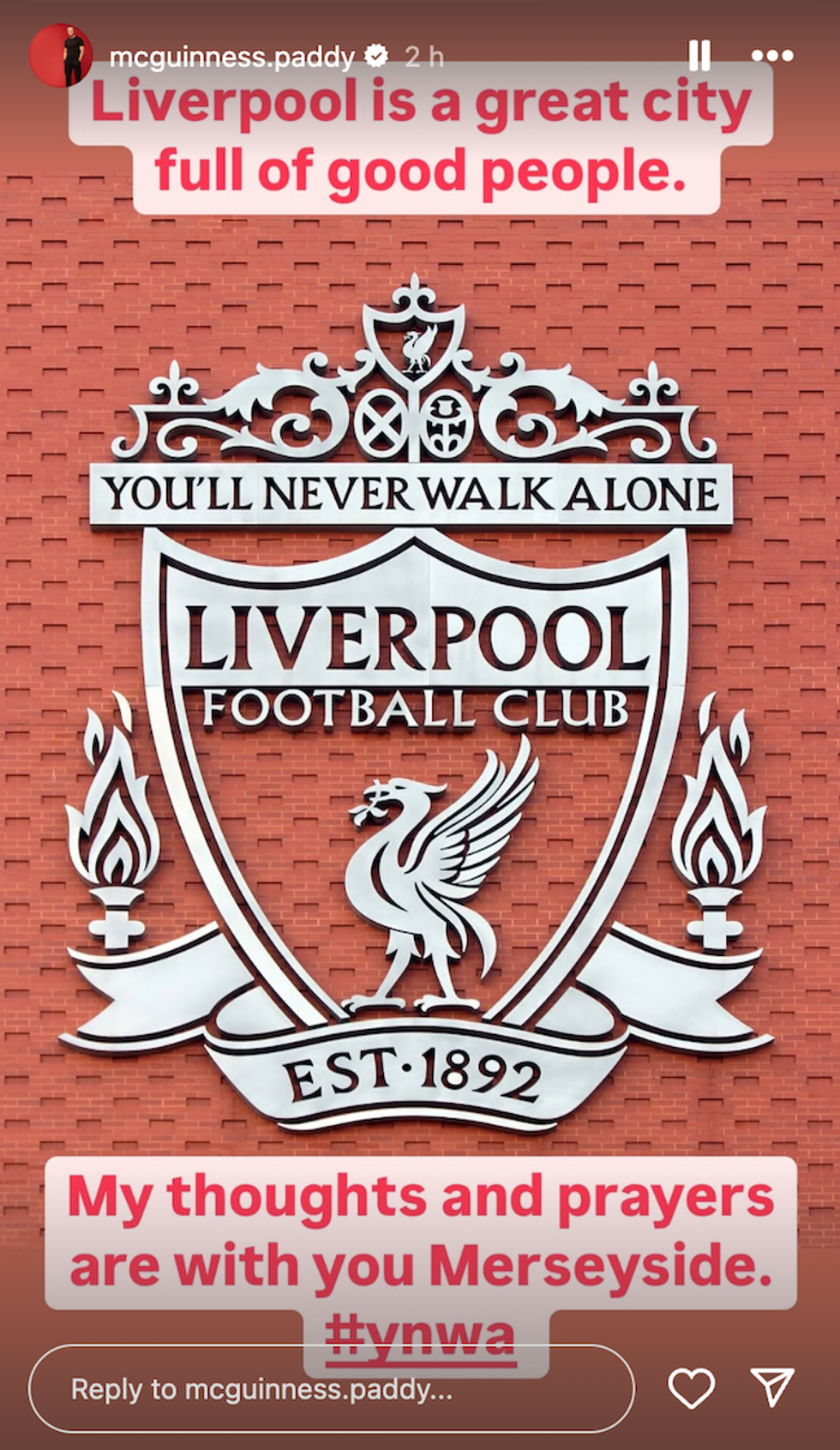 In an Instagram Story, comedian and presenter Paddy McGuinness wrote: “Liverpool is a great city full of good people. My thoughts and prayers are with you, Merseyside. #ynwa.”