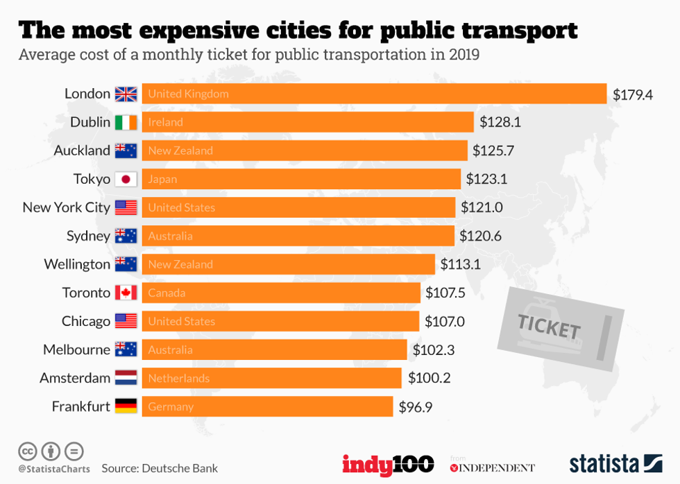Deutsche Bank recently released a survey of global prices and living standards from various cities and countries. Among the many different categories analysed was the price of public transport in 55 major cities.