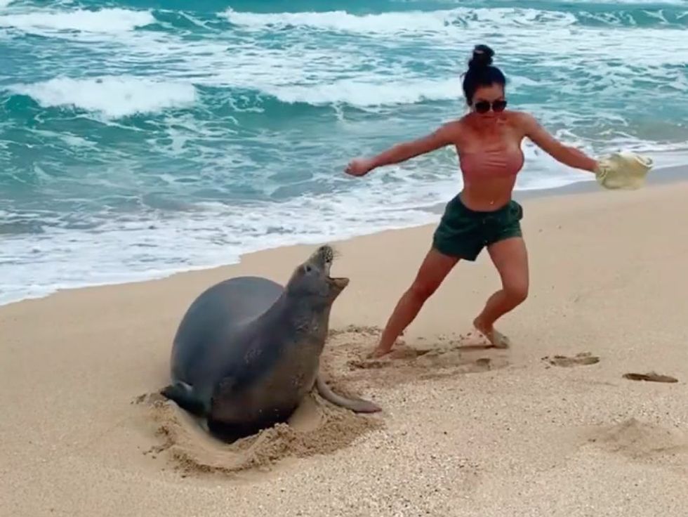 Authorities were alerted to the reckless act after a video posted to TikTok showed a woman touching the mammal at a Kauai beach in June.