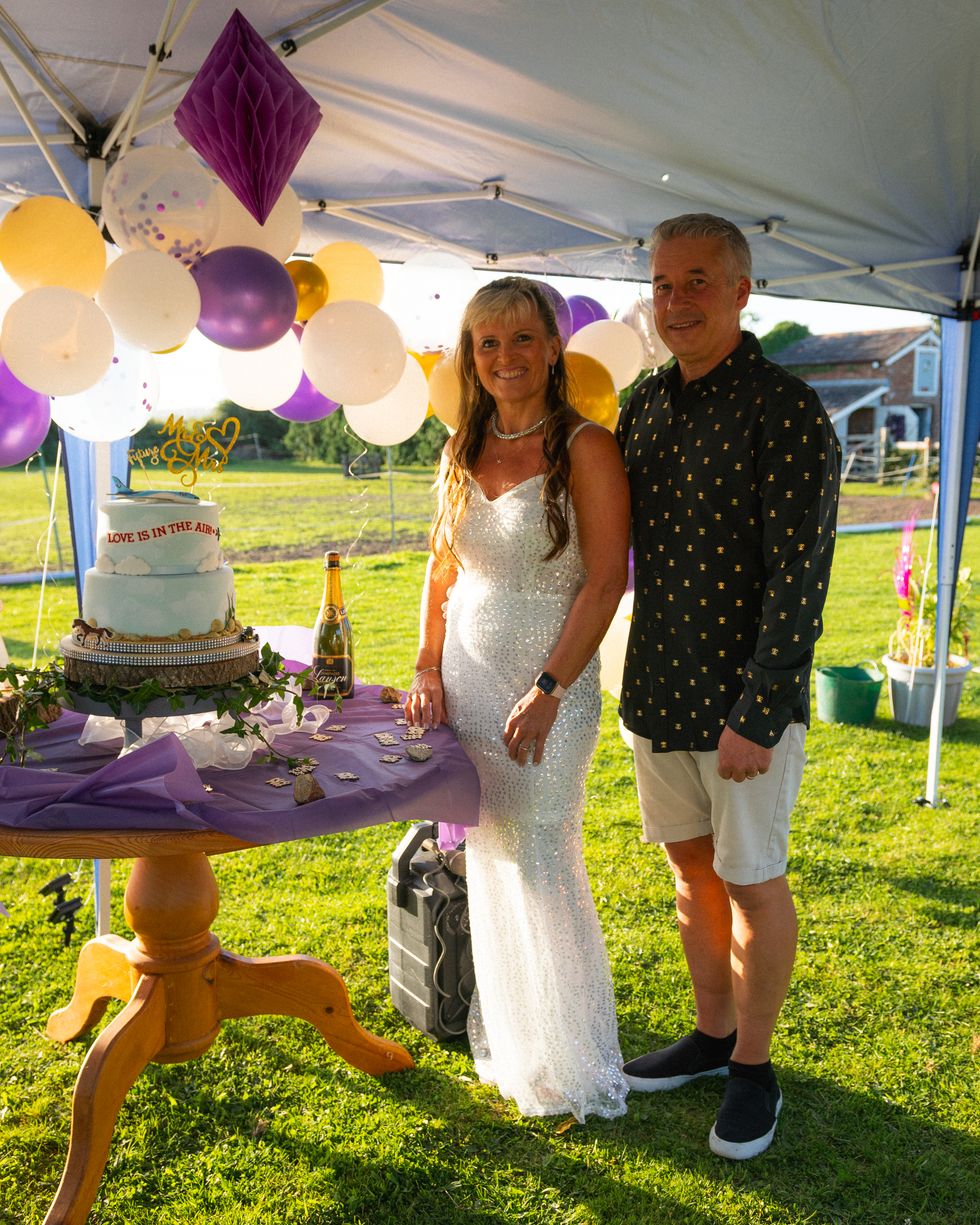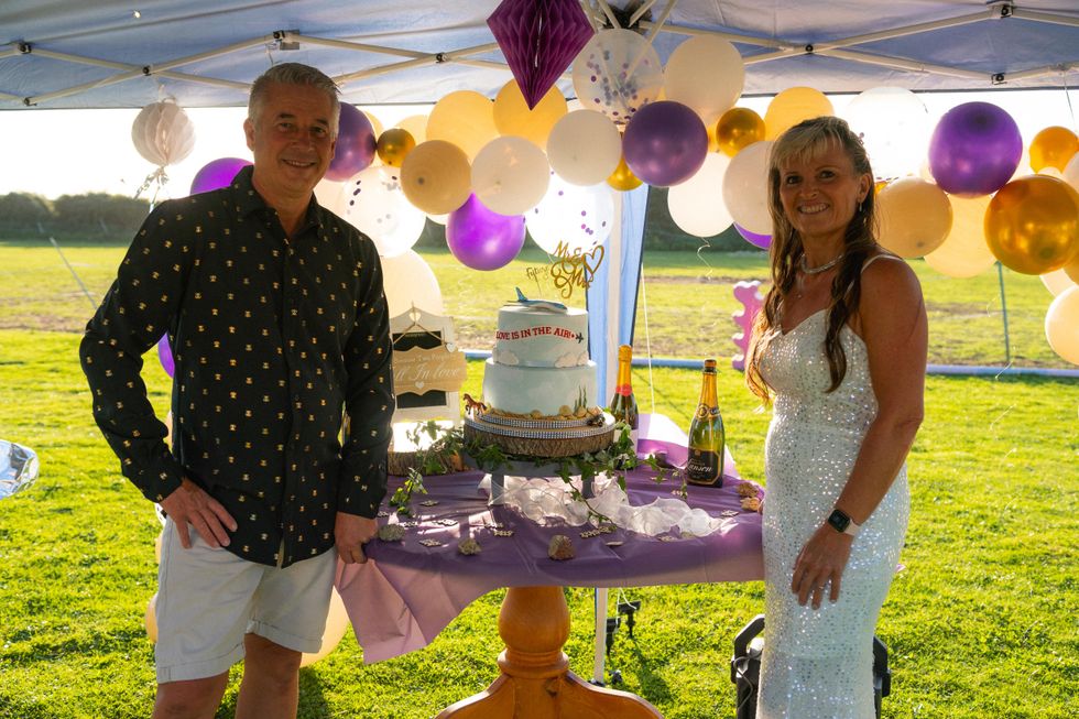 This weekend, they held a pre-wedding party in their garden with 80 friends and family, complete with a two-tier plane-themed cake given to them by Tui.