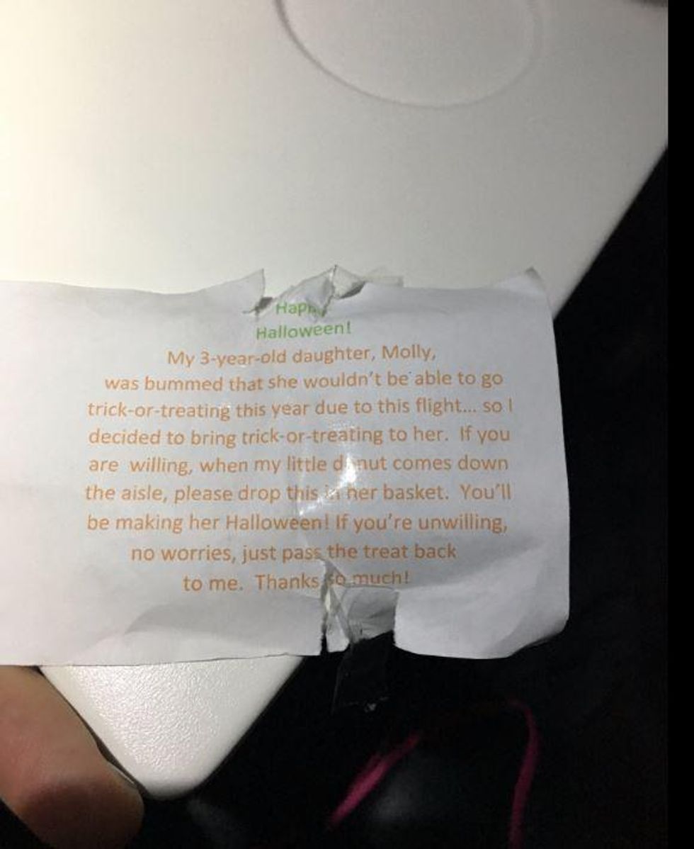 My three-year-old daughter, Molly, was bummed that she wouldn’t be able to go to trick-or-treating this year due to this flight…so I decided to bring trick-or-treating to her. If you are willing, when my little donut comes down the aisle, please drop this in her basket. You’ll be making her Halloween! If you’re unwilling, no worries just pass the treat back to me. Thanks so much!