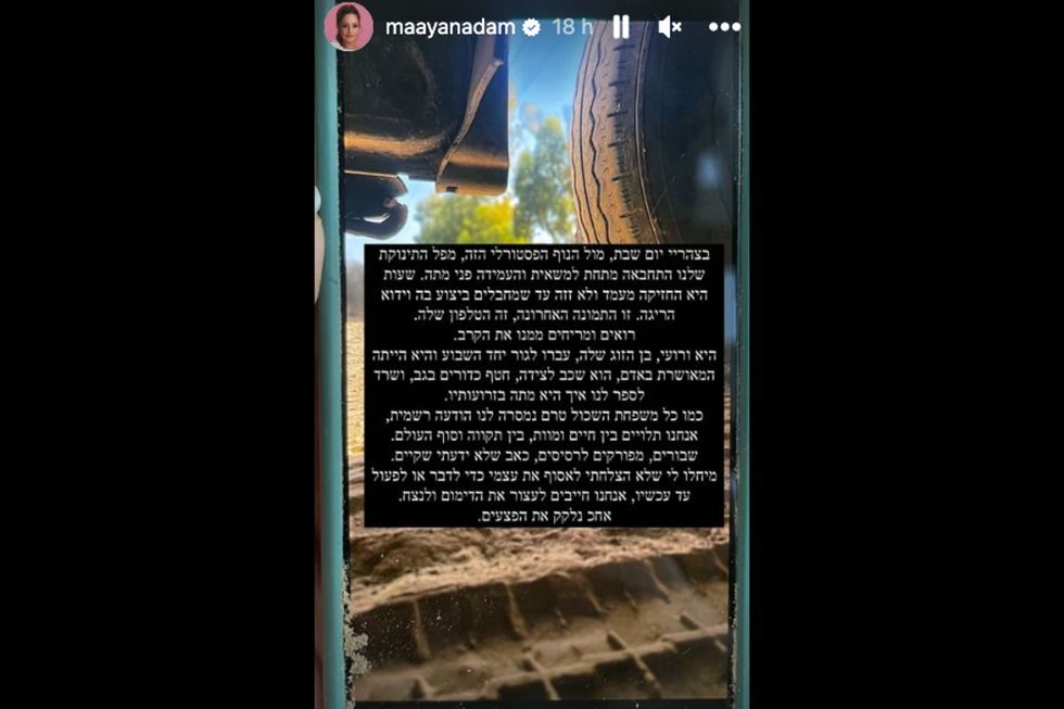 “On Saturday afternoon, in this idyllic setting, Mapal, our baby, hid beneath a truck and played dead,” Ma’ayan wrote in her message, which has been translated from the original Hebrew.