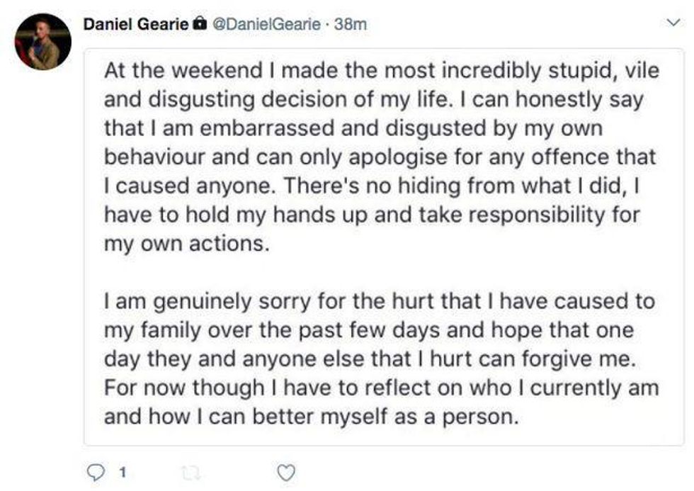 Gearie, who received heavy criticism in comments on social media, regarding the costume, later said he 'regretted' the incident. The now hidden post, is quoted by The Sun as reading: