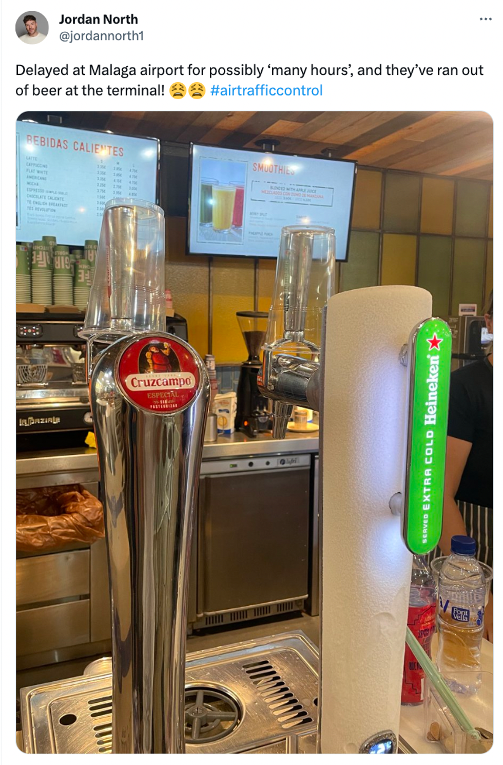 "Delayed at Malaga airport for possibly ‘many hours’, and they’ve ran out of beer at the terminal," he told his followers online, which was soon met by 'concerned' spectators about the "third world problem."
