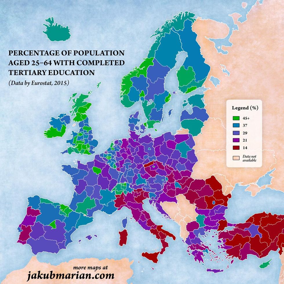 An infographic made by Czech linguist, mathematician, and artist Jakub Marian shows the percentage of people across Europe who have a degree.