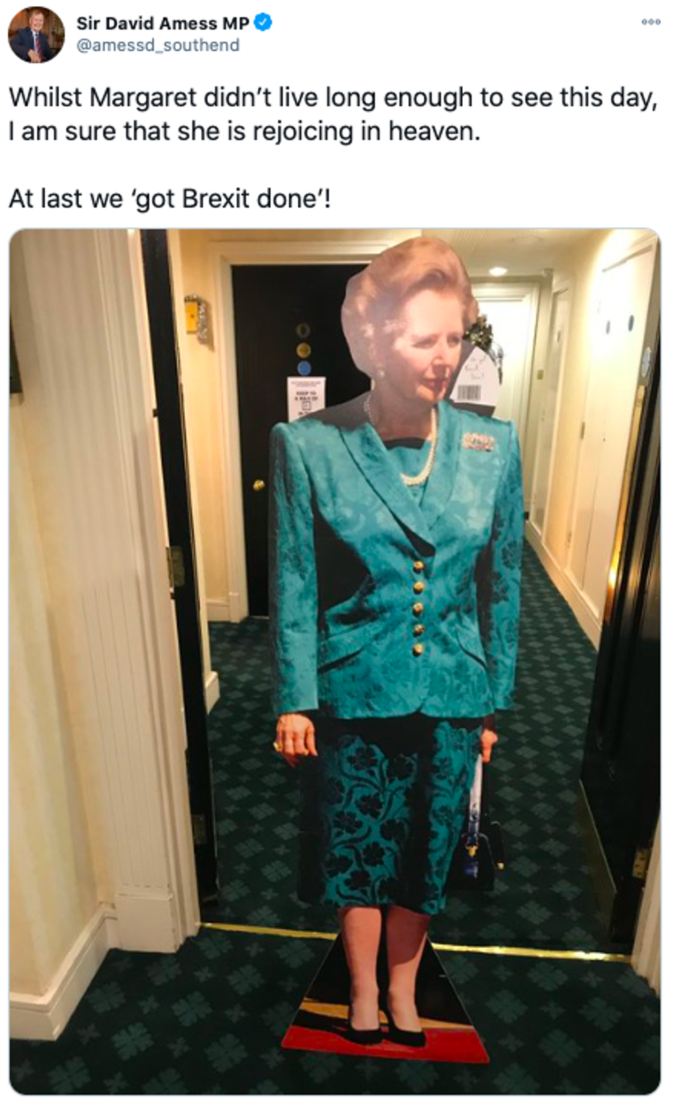 A Tory MP has bizarrely celebrated Brexit by sharing a picture of a cardboard cutout of Margaret Thatcher adding that ‘she is rejoicing in heaven.’