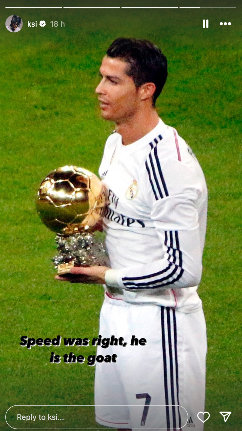 But now KSI seems to have gone back on that, posting a picture of Ronaldo on his Instagram story with the caption: "Speed was right, he is the GOAT."