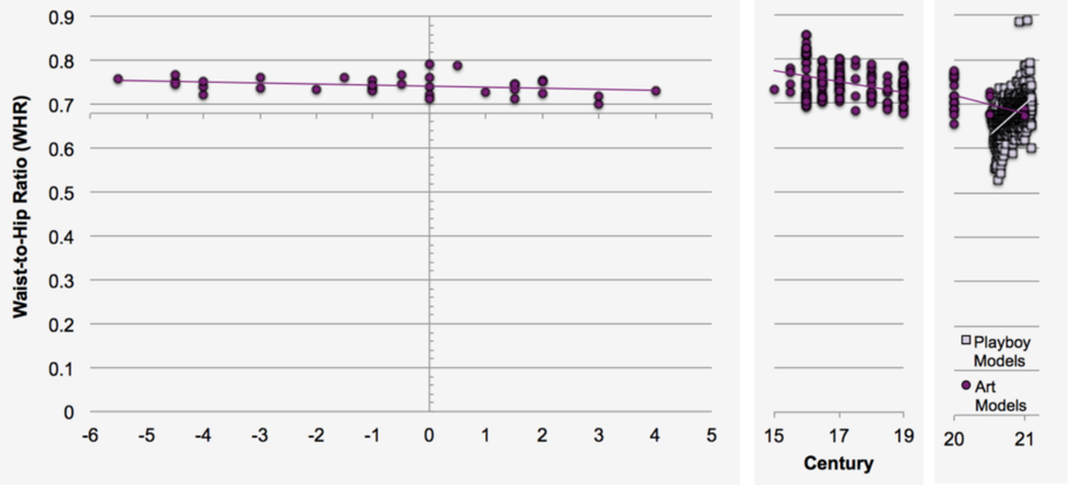 Researchers from the University of Montpellie and London School of Hygiene and Tropical Medicine investigated the evolution of WHR from 500 BCE to the present. They used painting and sculptures representing women who were considered beautiful, and analysed the evolution of WHR from 1920 to 2014 using measurements of Playboy models and winners of several Miss pageants.
