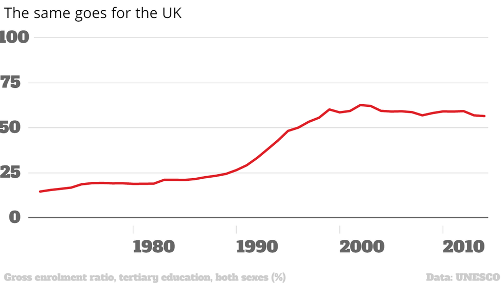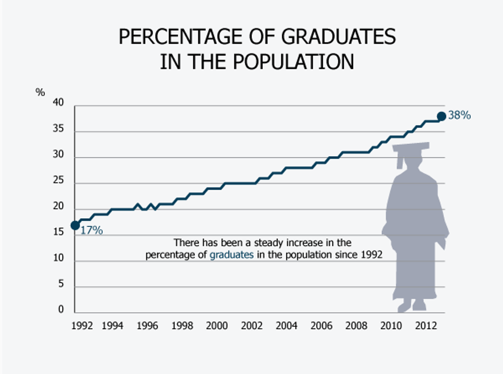 However, this hasn't translated into better employment rates for younger people in terms of full-time jobs, as more are sudying and older age groups are working later into their years. In addition high paying jobs have increased competition.