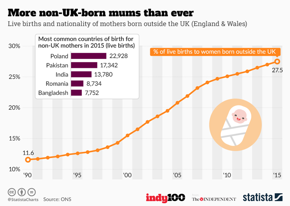Over a quarter of the live births in England and Wales in 2015 were to women born outside of the UK.