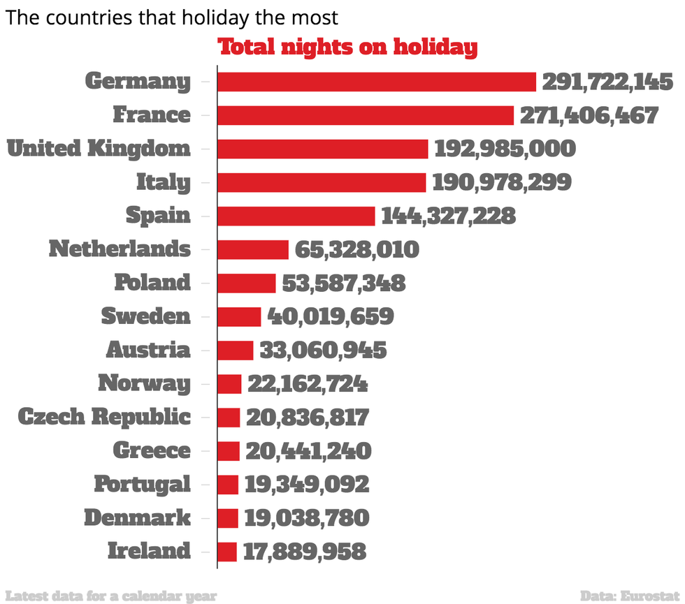 The UK came in third in terms of nights spent on holiday, behind France.