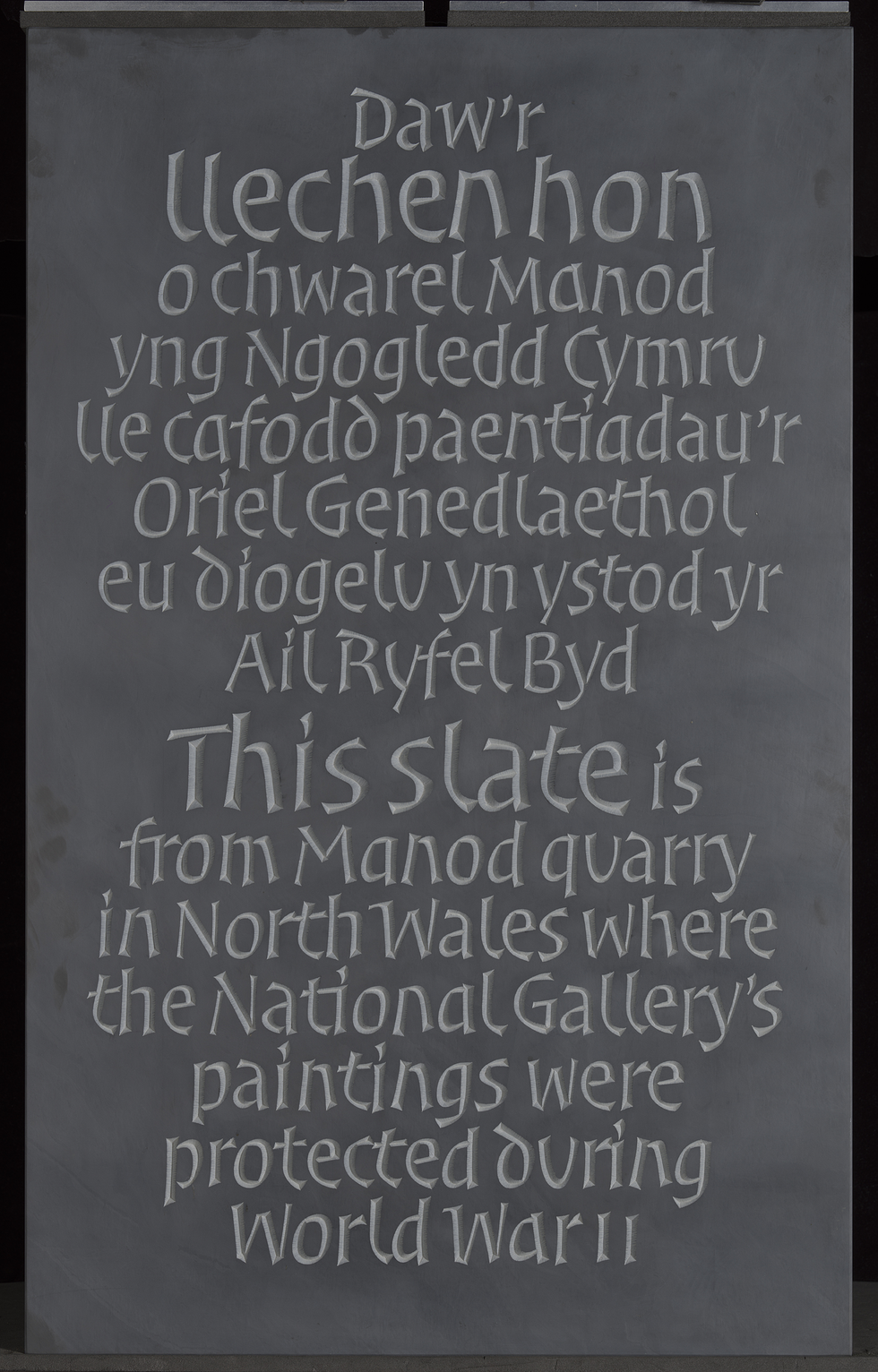 It reads “Daw’r llechen hon o chwarel Manod yng Ngogledd Cymru lle cafodd paentiadau’r Oriel Genedlaethol eu diogelu yn ystod yr Ail Ryfel Byd” which translates to “This slate is from Manod quarry in North Wales where the National Gallery’s paintings were protected during World War II”.