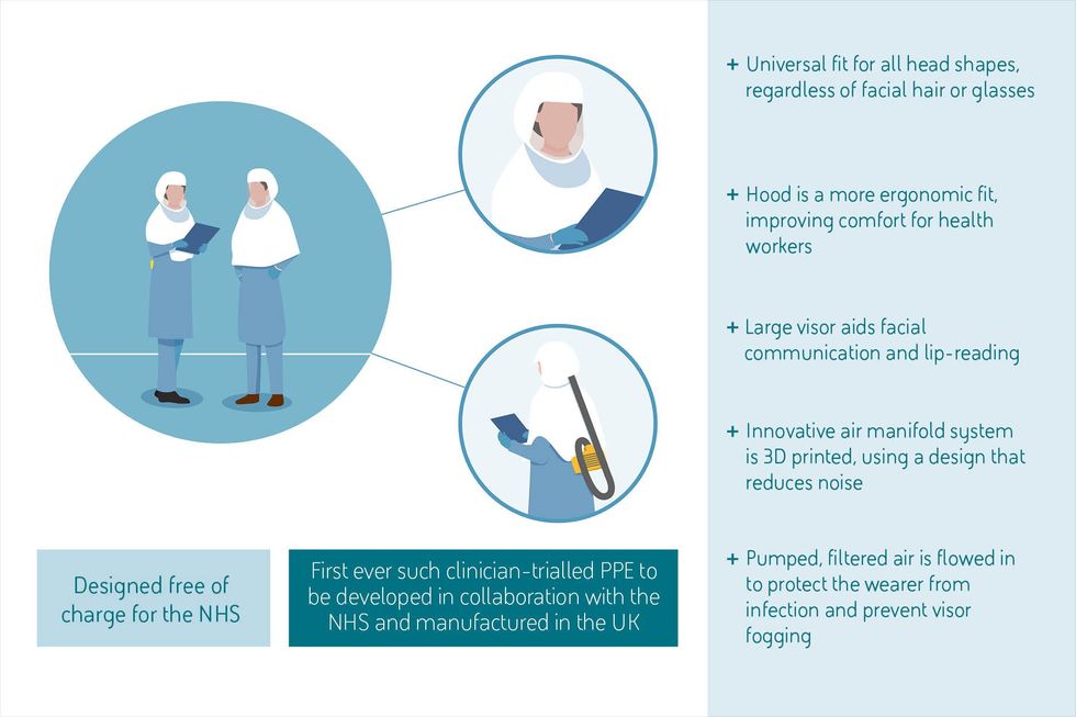 The full-face protective hood, which has a large, clear visor and can be worn as personal protective equipment (PPE), has been designed free of charge.