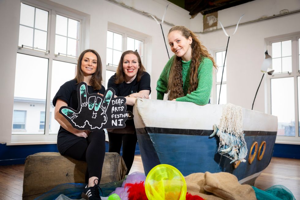 Sarah Lyle from Cre8 Theatre and Paula Clarke, artist, activist and performer, are pictured with Zoë McWhinney, The Fisherman’s Friend (Arts Council NI/PA)