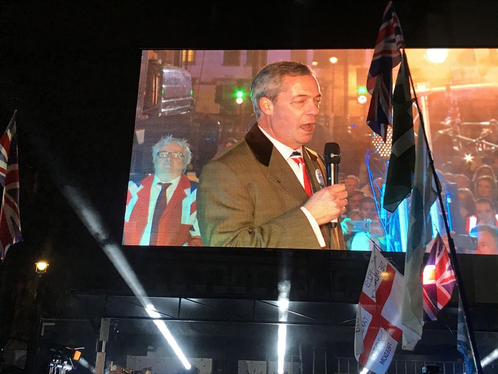 The event, organised by Leave Means Leave and headlined by Nigel Farage, is strictly booze-free, so of course I’ve brought an Evian bottle of vodka. The first thing I see as I reach Parliament Square are all the flags, flapping in the lights like Victorian hookers. Then the noise hits me, a low rumble of jeers, cheers and incoherent football chants. This being London, the first actual conversation I hear is in Italian.