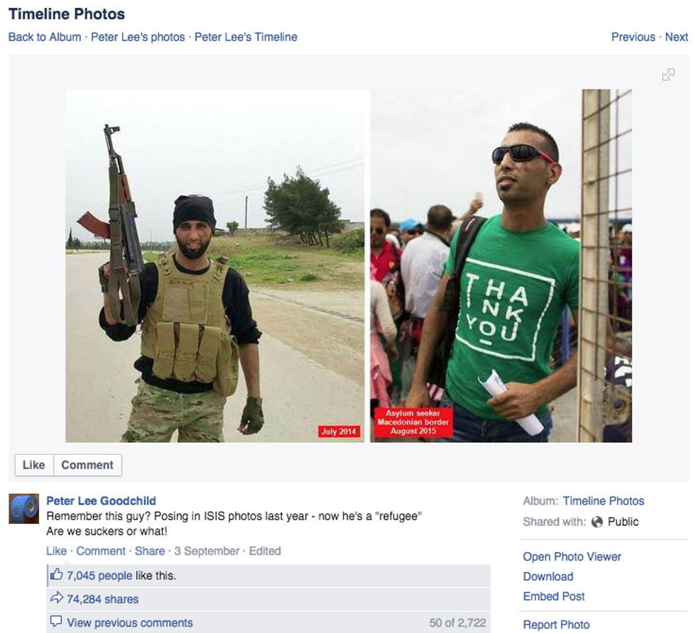 A caption on one prominent post on Facebook reads: "Remember this guy? Posing in ISIS photos last year - now he's a 'refugee'. Are we suckers or what!"