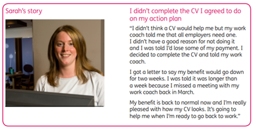The leaflet used stock images and 'testimonies' from people who claimed to have interacted with the sanctions system and found it of benefit to them.