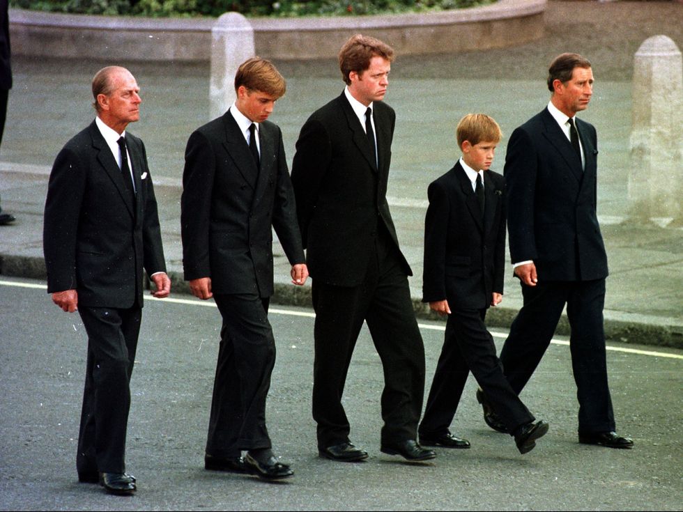 It was there that Philip, Prince Charles, his two sons and their uncle the Earl Spencer joined the procession, walking solemnly behind the funeral cortege in a now profoundly symbolic image.