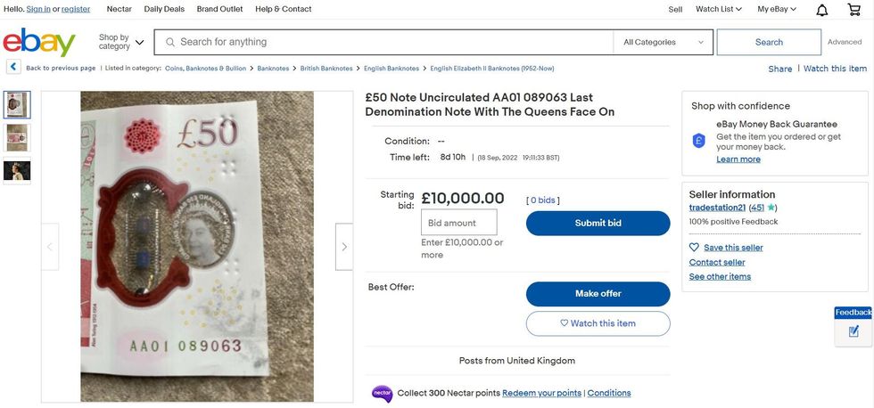 One seller has eyed up this potential money-making opportunity by being one step ahead and posting a new polymer £50 note for sale with the hefty price tag of £10,000 as the starting bid, less than an hour after the Queen's death was announced.