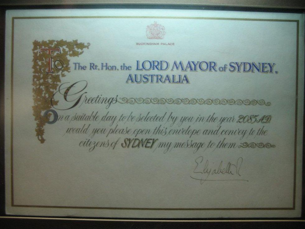 "On a suitable day to be selected by you in the year 2085 AD, would you please open this envelope and convey to the citizens of Sydney my message to them," Queen Elizabeth II wrote.
