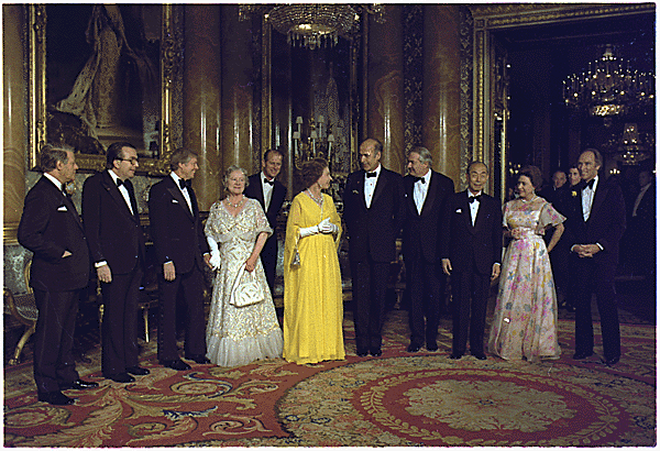 Following a NATO Ministerial Meeting in London, President Carter dinner alongside Queen Elizabeth II in May 1977.