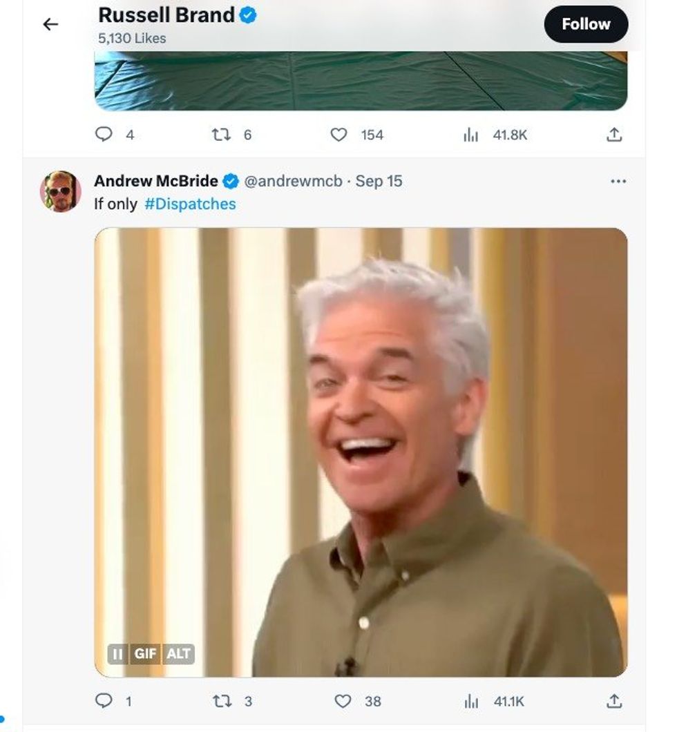 Since then, Brand has liked a tweet from an X/Twitter user which features the Dispatches hashtag and a GIF of Schofield. The only words in the post are 'If only.'