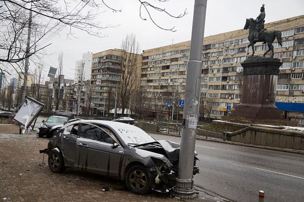 The streets of Kyiv on Tuesday this week. A crashed car was left abandoned.