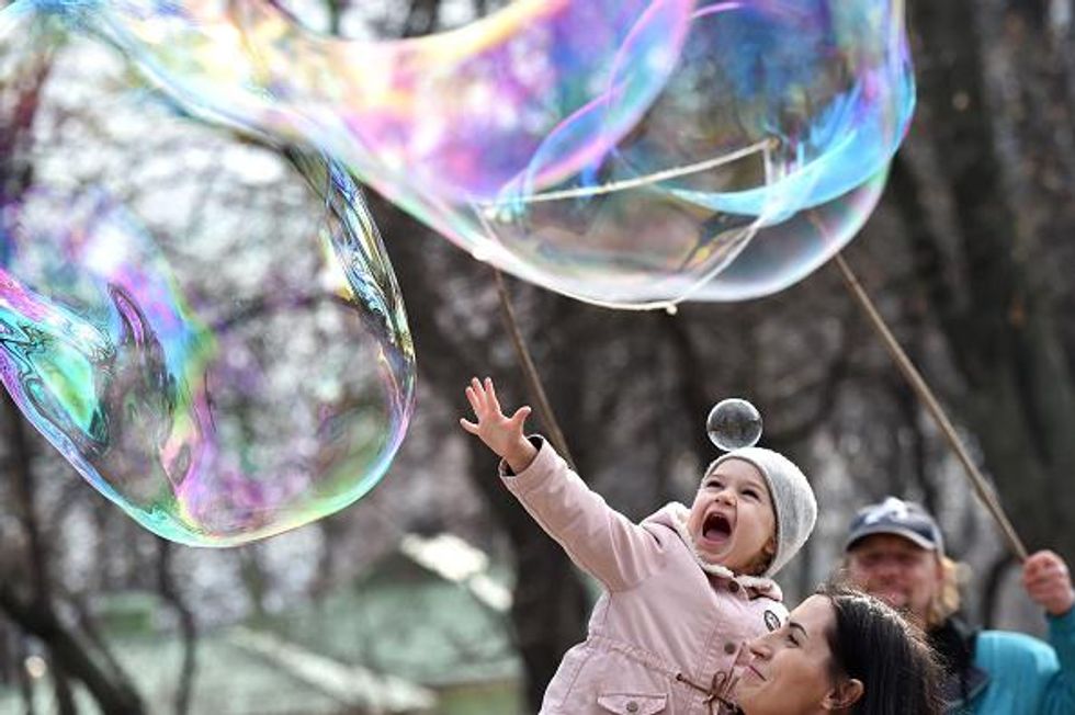 A young child photographed watching bubbles in a park in Kyiv in 2018