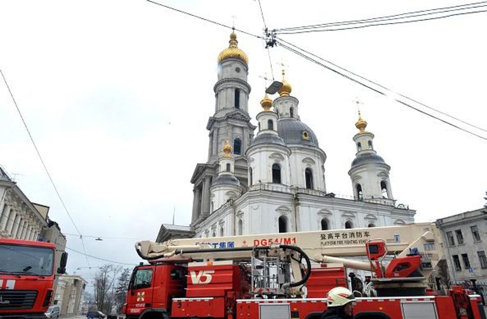 Emergency vehicles wail past the Dormition Cathedral on Wednesday