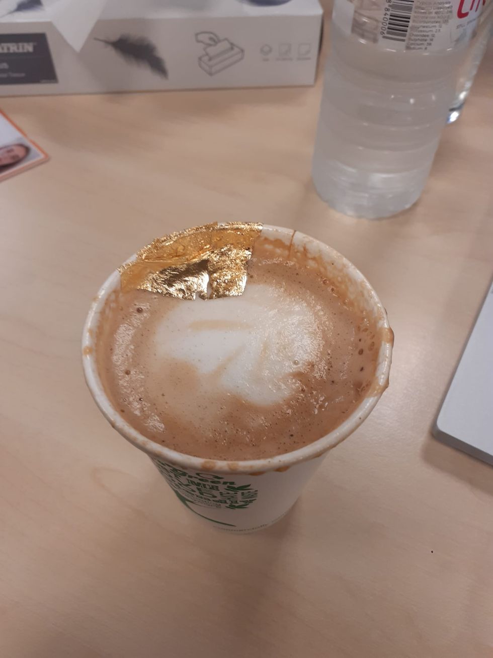 ‘Ccino (well, flat white) acquired, I lift the lid to an exhalation of steam and balance a square of Amazon’s finest 24-karat gold sheet over the paper cup. It straddles it precariously, not quite reaching every side before drooping against the inside and melting.