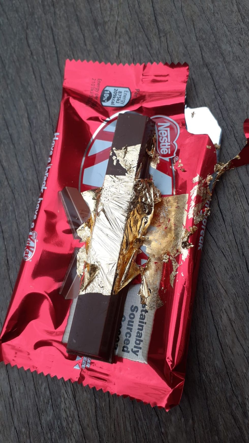 To show willing, I unwrap a KitKat from its silver-foiled sleeve and... rewrap it in gold.