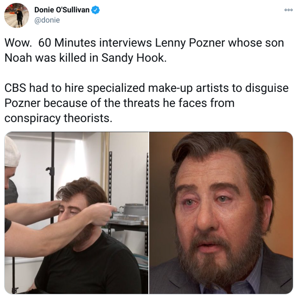 Now a father of a boy who was killed during the 2012 school shooting has been given a full facial disguise before being interviewed on television, purely to protect him from being identified by conspiracy theorists who might threaten or harm him.