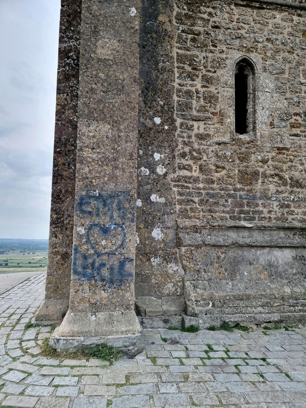 Michelle Cowbourne, 53, was out walking on Glastonbury Tor earlier this week when she spotted graffiti on St Michael's Tower.